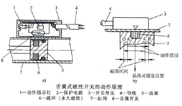 將舌簧開(kāi)關(guān)成型于合成樹(shù)脂塊內(nèi),帶有磁環(huán)的氣缸活塞向右運(yùn)動(dòng)到A位置,舌簧開(kāi)關(guān)進(jìn)入磁場(chǎng)內(nèi),兩簧片被磁化而相互吸引,觸點(diǎn)閉合,發(fā)出一電信號(hào);活塞運(yùn)動(dòng)到B位置時(shí),舌簧開(kāi)關(guān)離開(kāi)磁場(chǎng),簧片失磁,觸點(diǎn)自動(dòng)脫開(kāi)。A-B區(qū)間稱(chēng)為磁性開(kāi)關(guān)的動(dòng)作范圍。活塞向左反向運(yùn)動(dòng)時(shí),動(dòng)作范圍是C-D區(qū)間。有觸點(diǎn)式磁性開(kāi)關(guān)的動(dòng)作范圍一般在5-14mm。B-C區(qū)間和D-A區(qū)間稱(chēng)為磁滯區(qū)間,此區(qū)間通常小于2mm。扣除磁滯區(qū)間的動(dòng)作范圍為最適合安裝位置,其中間位置稱(chēng)為最高靈敏度位置。若磁環(huán)停止在磁滯位置,則開(kāi)關(guān)動(dòng)作不穩(wěn)定,易受外界干擾。